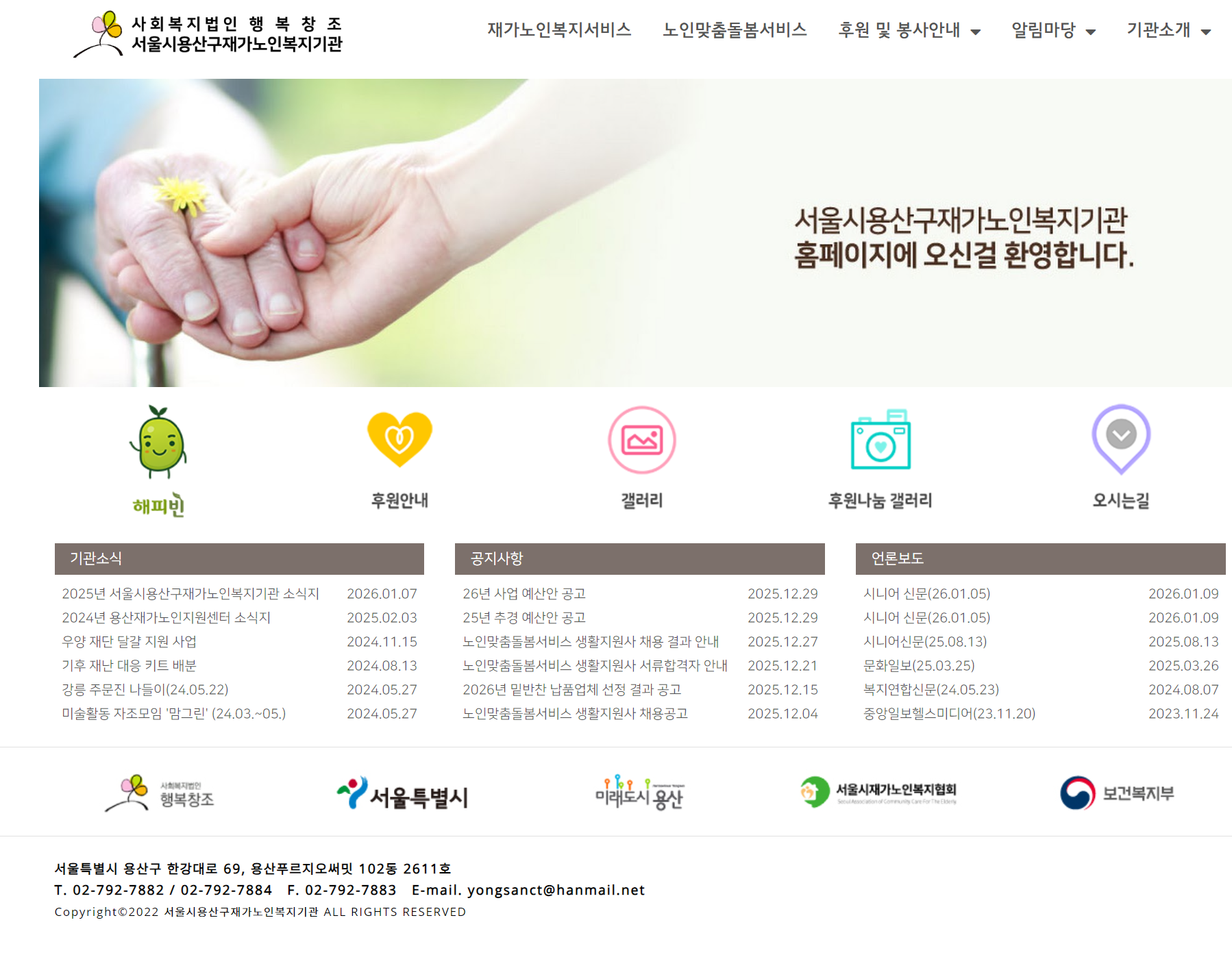 서울시용산구재가노인복지기관은 취약계층인 어르신들에게 맞춤형 서비스를 제공해 드립니다.