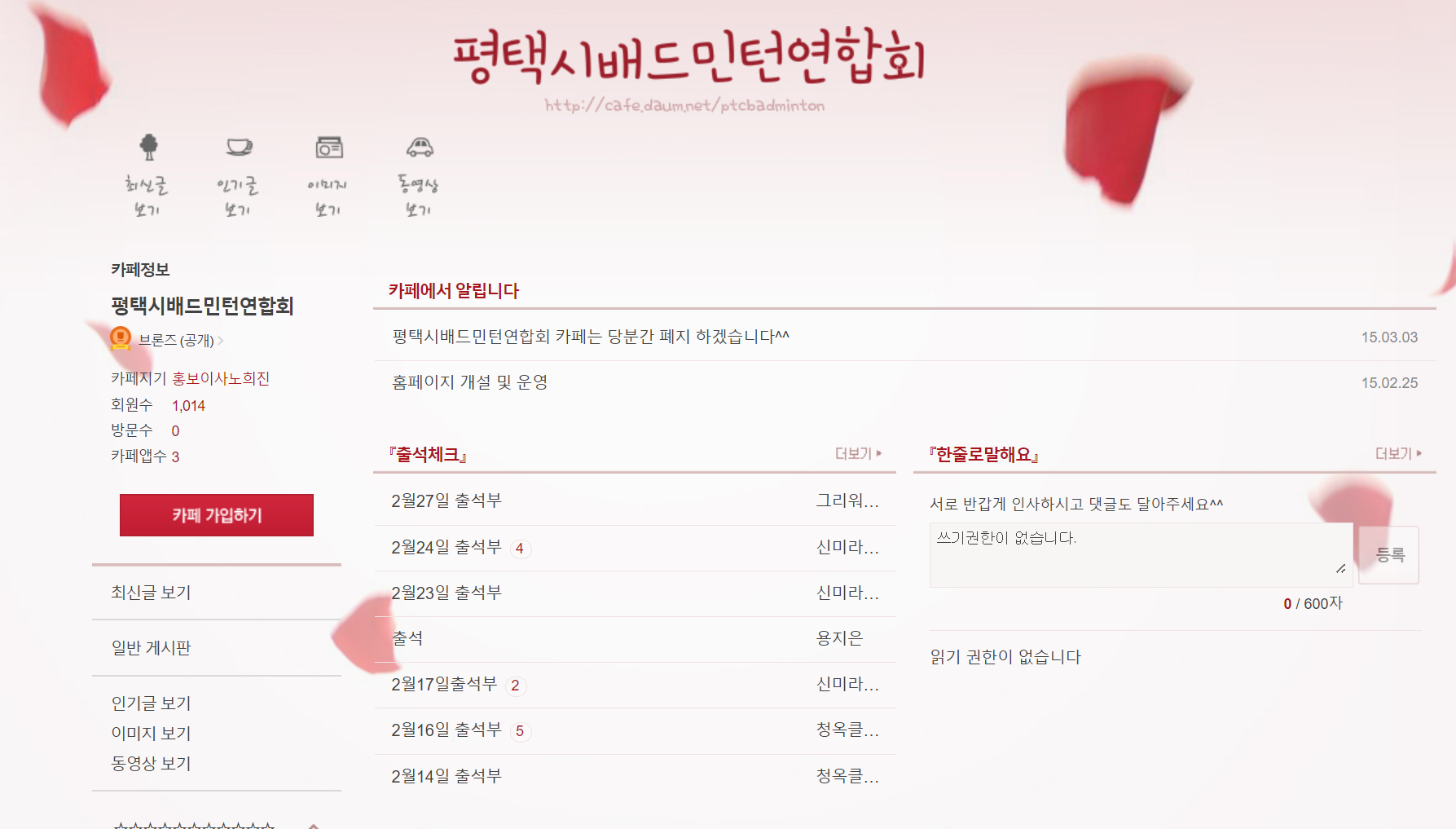 안녕하세요. 평택시 배드민턴 연합회 카페입니다. 좋은 사람들과 배드민턴에 관한 좋은 정보를 함께 공유하고 싶습니다. 여기 오시는 모든 분들 언제나 행복하시구요 ^^*