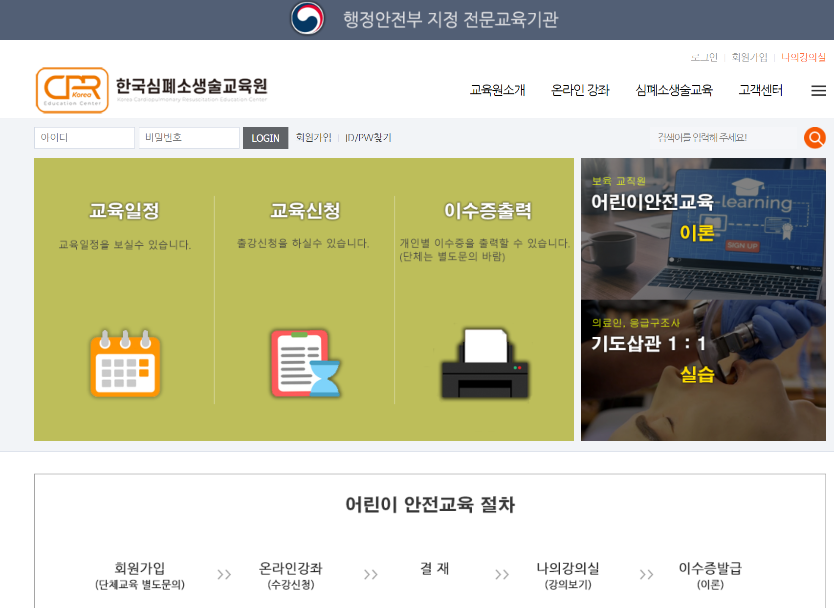 행정안전부 지정 어린이안전교육, 심폐소생술 전문교육기관(어린이집, 유치원, 학교, 기업체 전국 출강), AED, 기도삽관 개인교육, 이수증