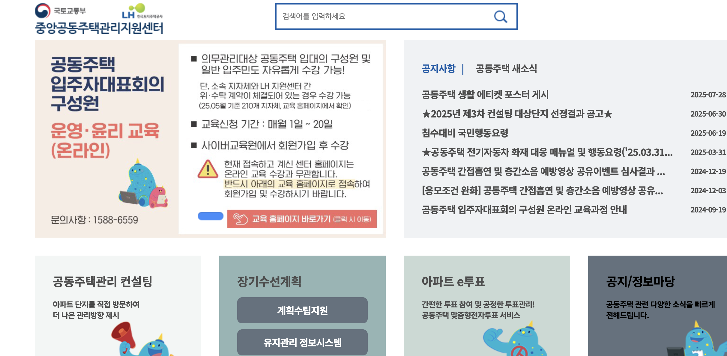 공동주택 관리지원 서비스(공동주택관리 관리진단, 공사기술자문, 상담, 입주자대표회의 온라인교육, 주택관리사등 배치 및 보수교육(온라인 제공) 등) 제공
