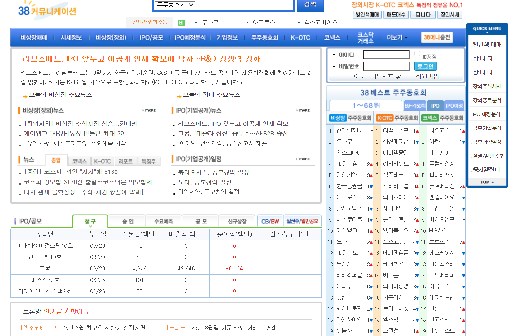 비상장주식,장외주식시장 NO.1 38커뮤니케이션.비상장거래/매매,시세정보,IPO기업분석,공모주,상장폐지주식,퇴출종목,K-OTC,코넥스 정보 제공