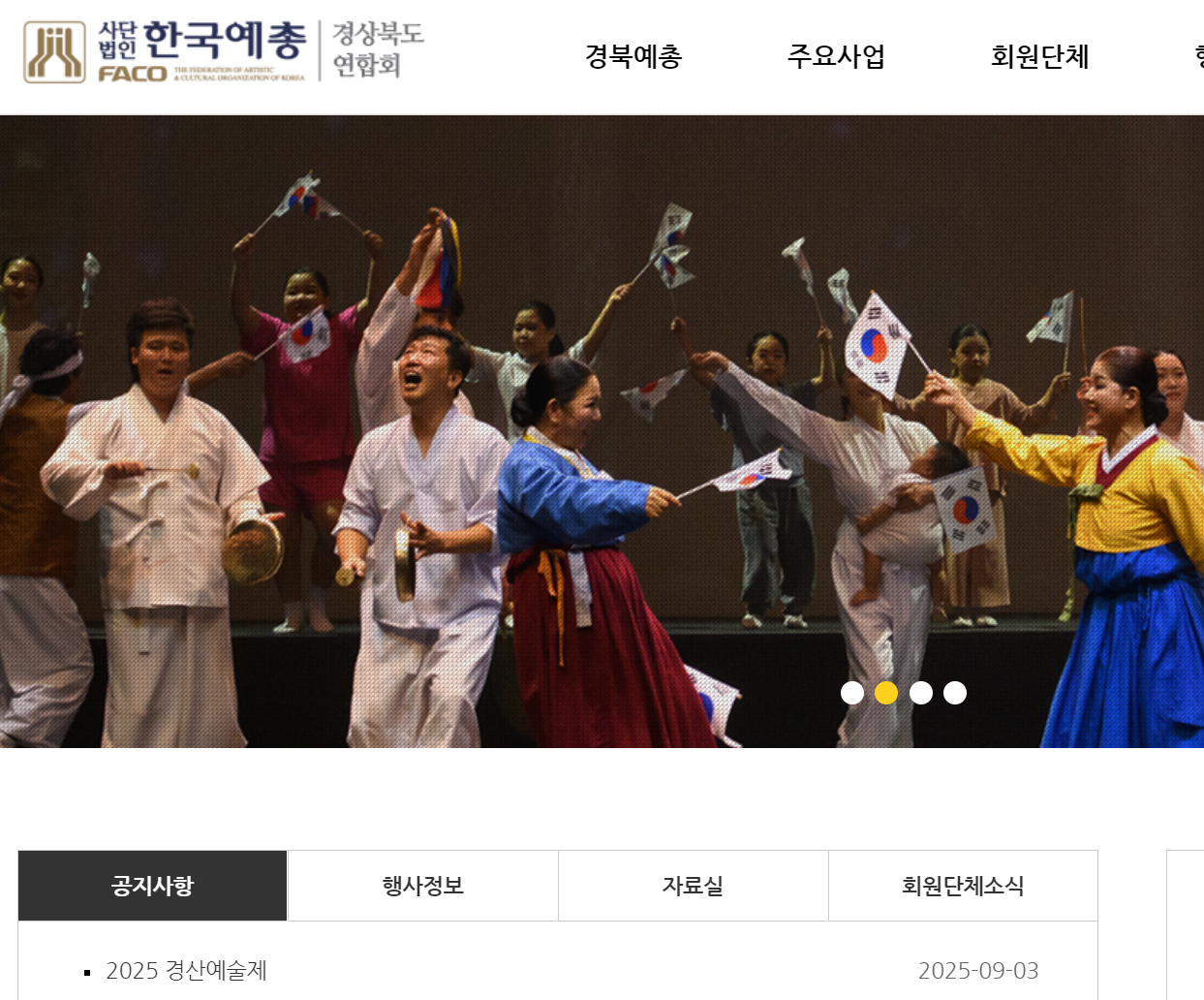 한국예총 경상북도연합회, 경북예총, 예총소개, 영남예술아카데미, 회원단체, 행사안내, 자료실, 커뮤니티