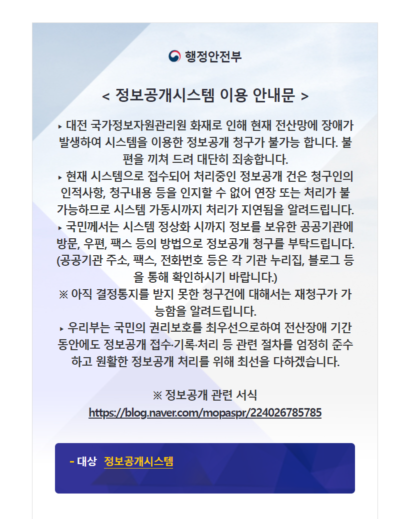 < 정보공개시스템 이용 안내문 > ‣ 대전 국가정보자원관리원 화재로 인해 현재 전산망에 장애가 발생하여 시스템을 이용한 정보공개 청구가 불가능 합니다. 불편을 끼쳐 드려 대단히 죄송합니